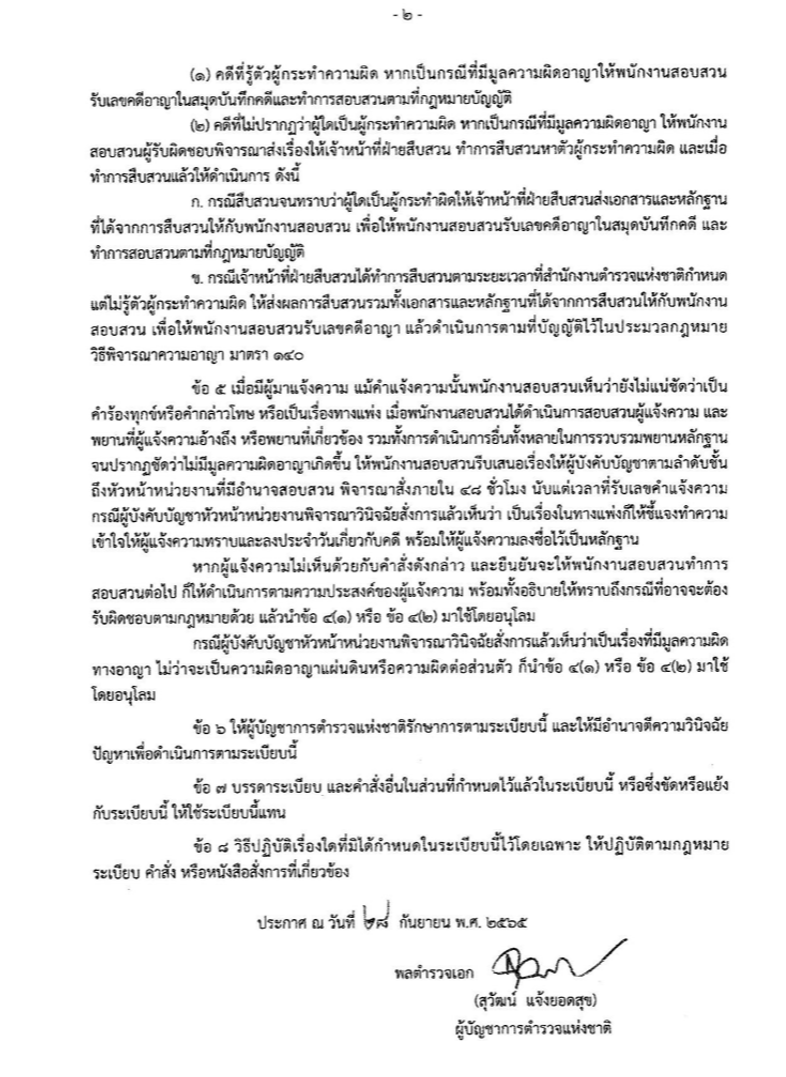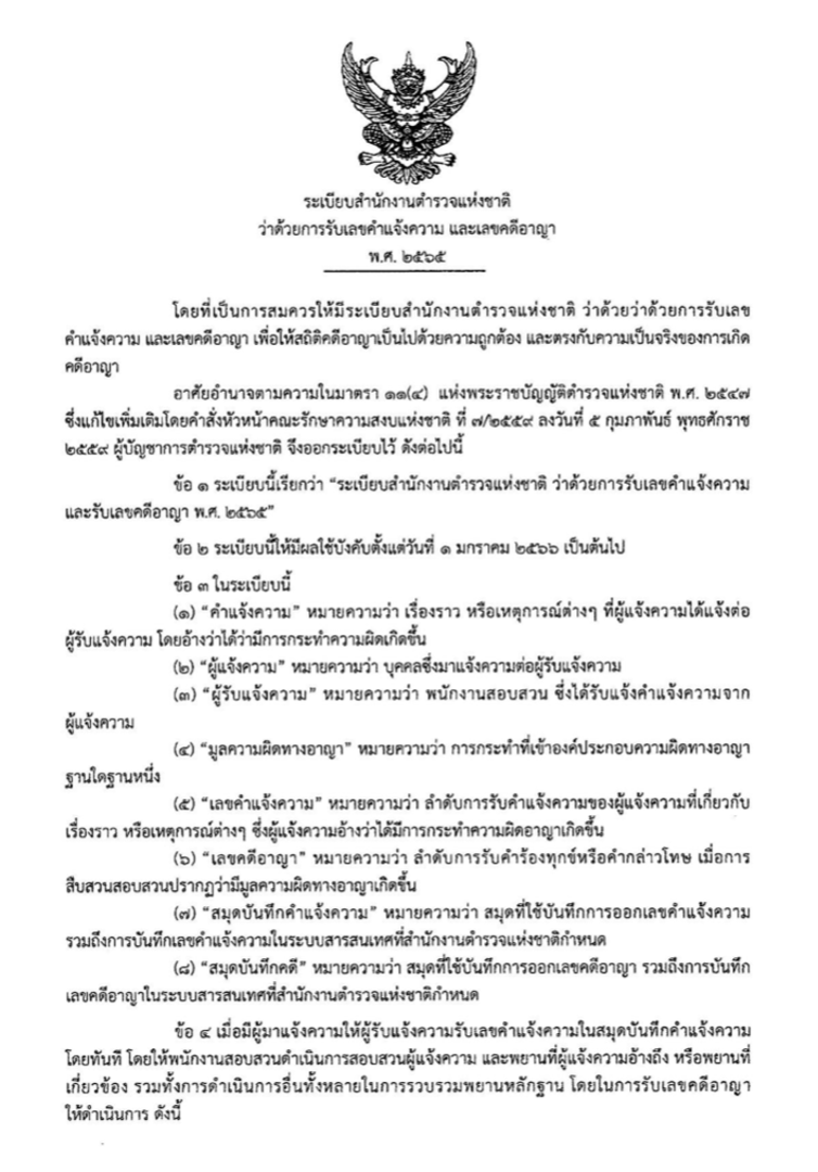 ตามระเบียบสำนักงานตำรวจแห่งชาติ ว่าด้วยการรับเลขคำแจ้งความและเลขคดีอาญา พ.ศ.2565